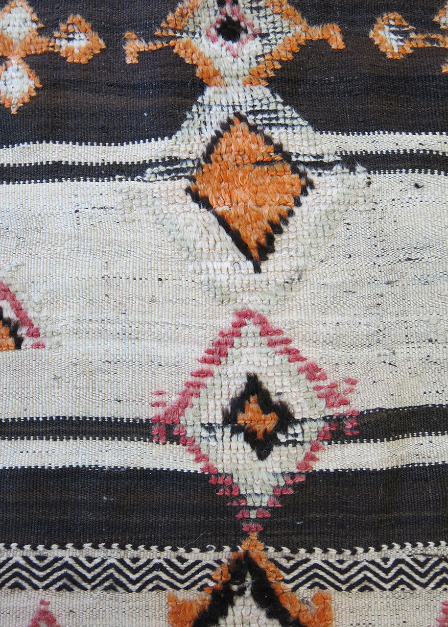 This vintage Moroccan rug features a striking combination of flatweave and hand-knotted pile. Woven from natural wool, it displays earthy browns, muted pinks, and warm yellows in traditional Berber geometric motifs, such as diamonds and zigzags, symbolizing protection and abundance. The balance of flatweave texture with the raised pile detailing adds depth and dimension. Finished with a fringe, this rug brings an authentic touch of Moroccan craftsmanship to any space.