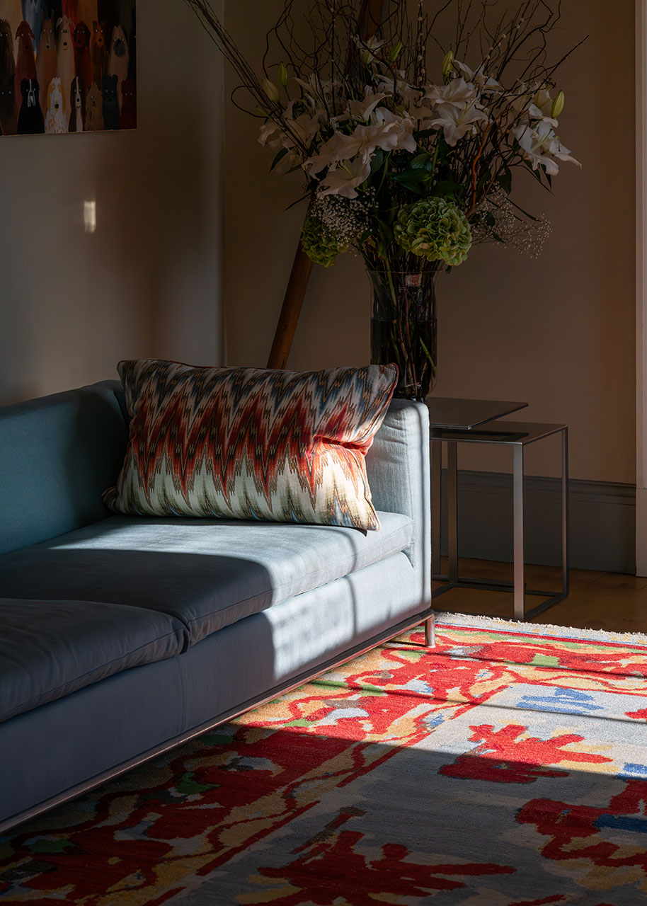 With the large and simple motifs of a tribal or village Konya carpet, a very generous border of meandering cursive guard stripes encloses a blocky ribbon. Large stellar designs in madder red explode across the delicate blue and indigo field of this rug, surrounding a central, abstract, knot motif. The colours are also in keeping with a Konya carpet, with their rich madder reds, gentle buckthorn yellows and the wonderful greens obtained from over-dyeing indigo with the aforementioned buckthorn. This was the first carpet to be designed and created for this collection, defining the starting point for the visual language we would continue to explore.